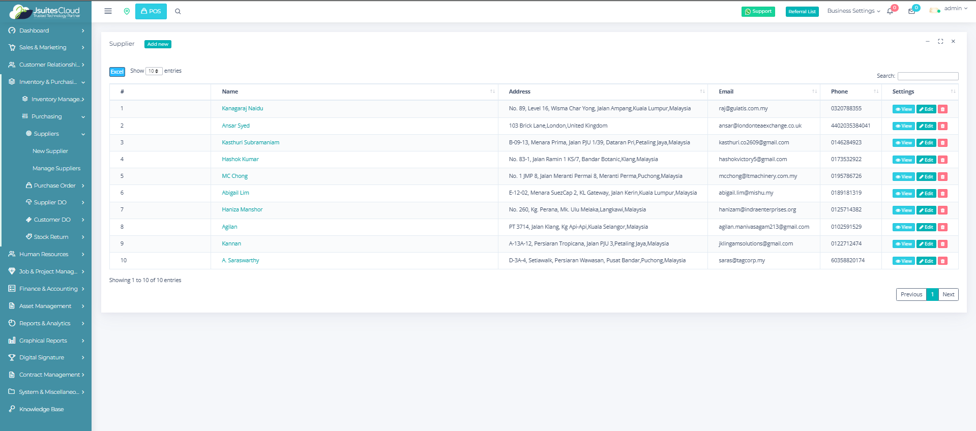 The **Manage Suppliers** feature provides a centralized list of all registered suppliers, allowing users to view, edit, and manage supplier details.