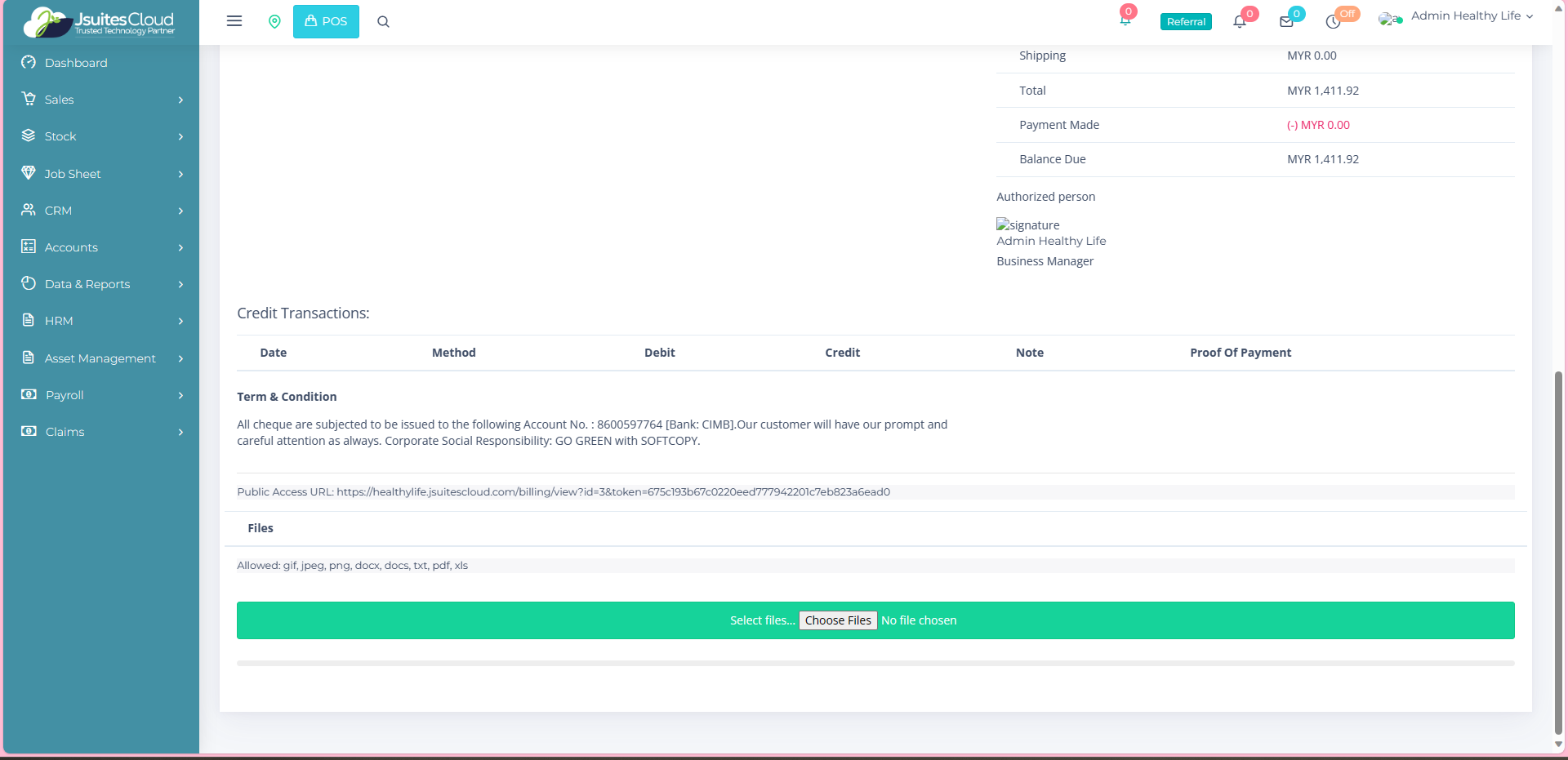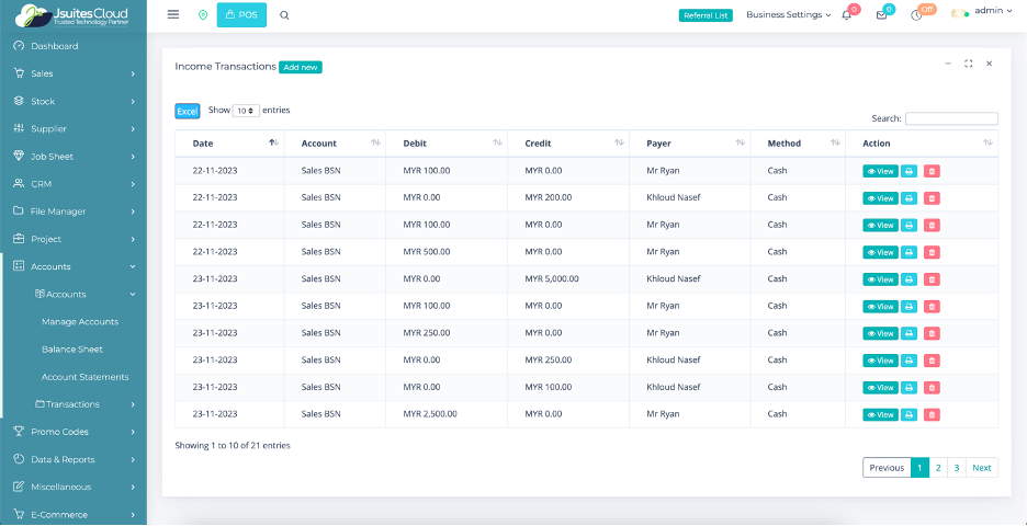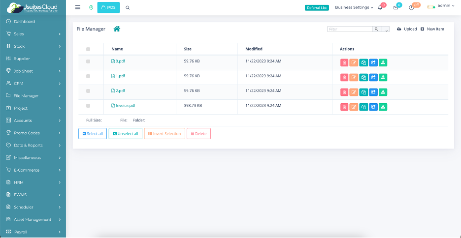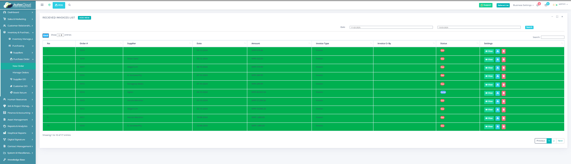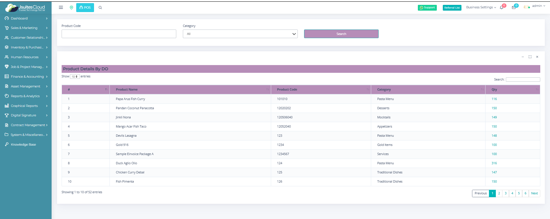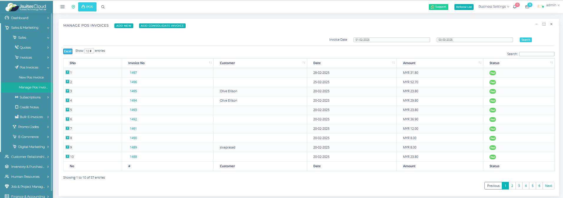 This section allows businesses to manage Point of Sale (POS) invoices, track customer transactions, and monitor payment statuses. Users can view a list of generated POS invoices with key details such as Invoice Number, Customer, Date, Amount, and Status.