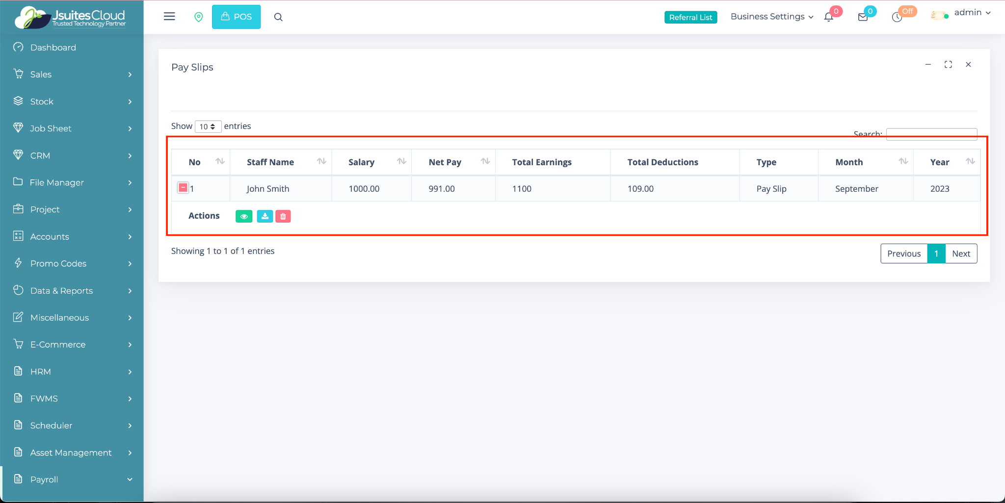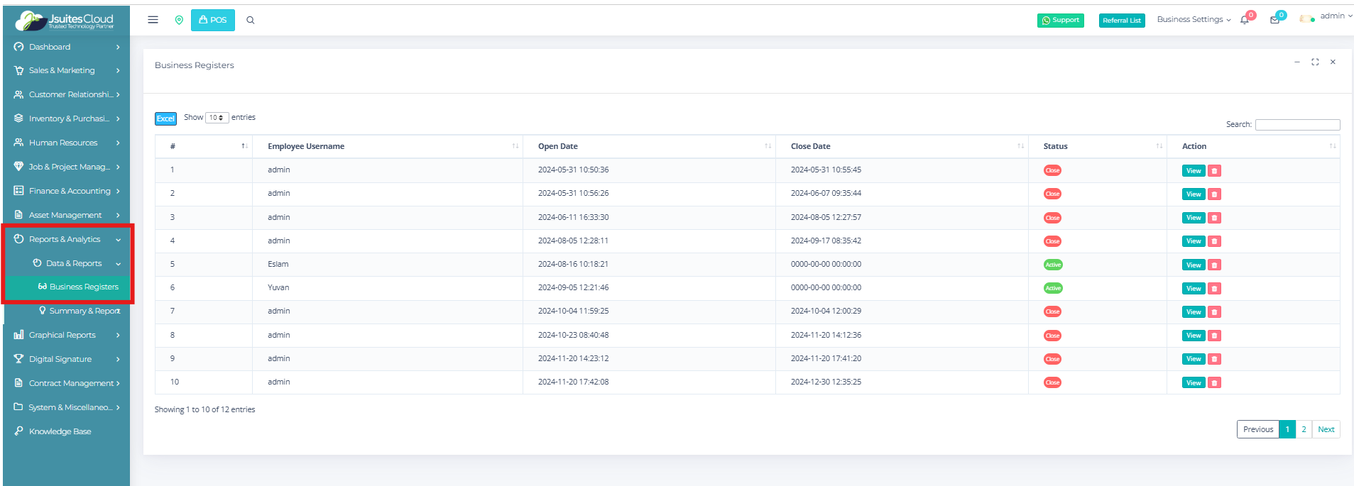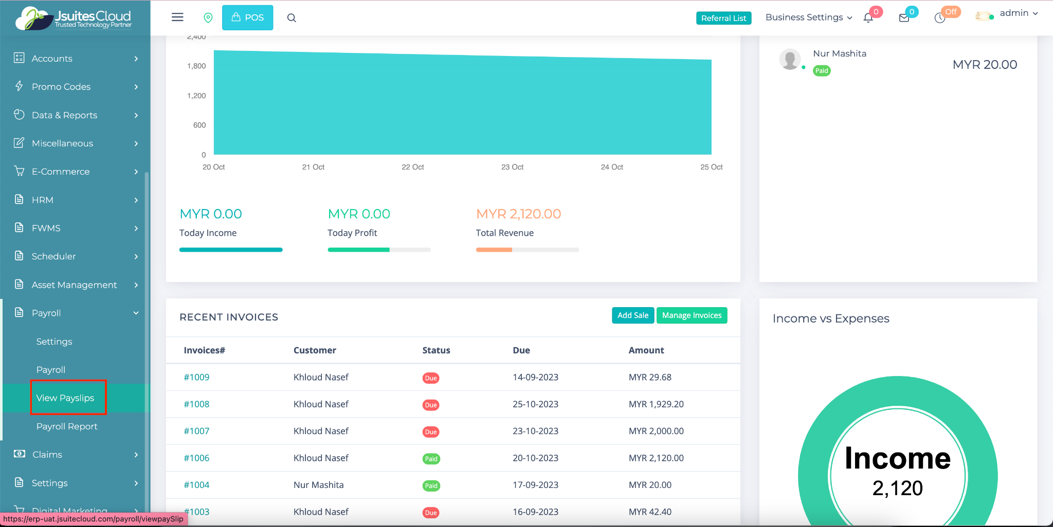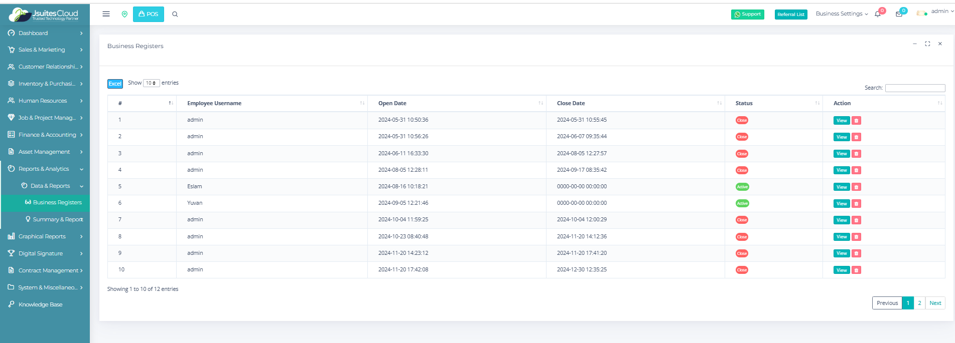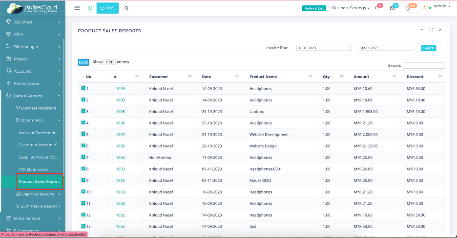This section allows businesses to manage Point of Sale (POS) invoices, track customer transactions, and monitor payment statuses. Users can view a list of generated POS invoices with key details such as Invoice Number, Customer, Date, Amount, and Status.
