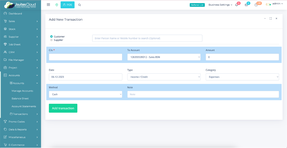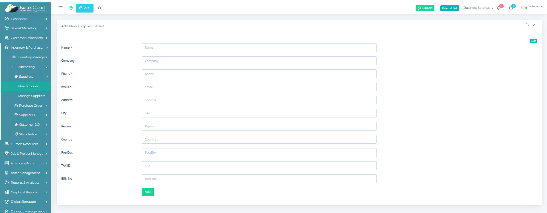 The **New Supplier** feature enables users to add supplier details to the system. The form includes fields for essential supplier information such as: