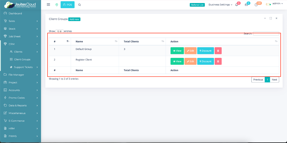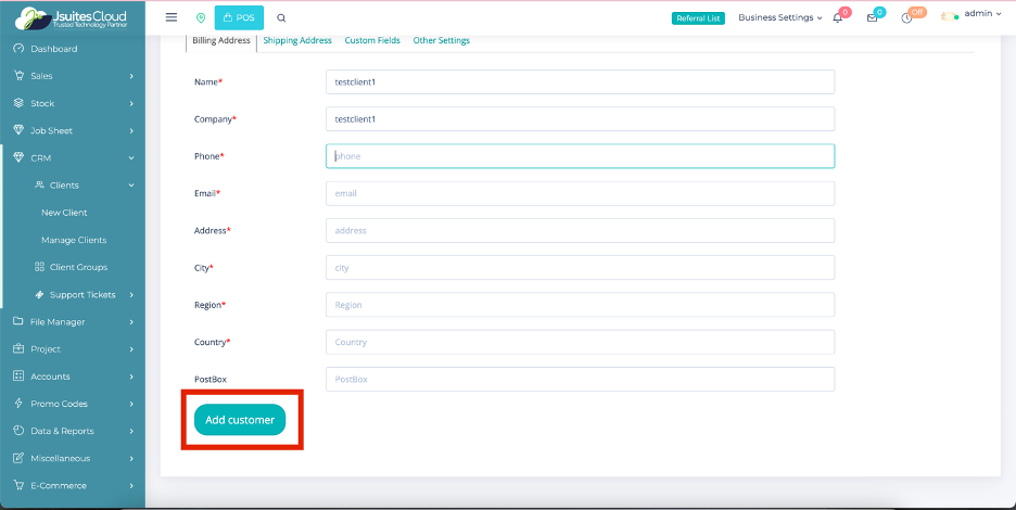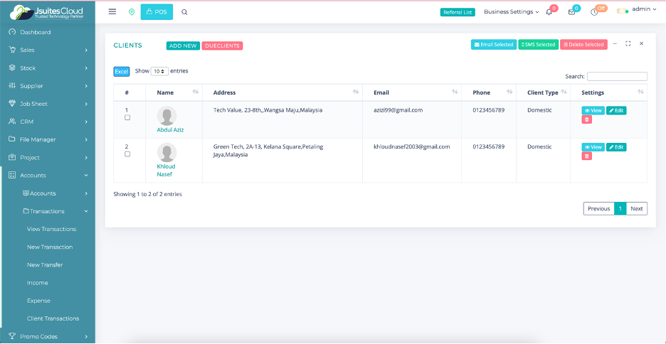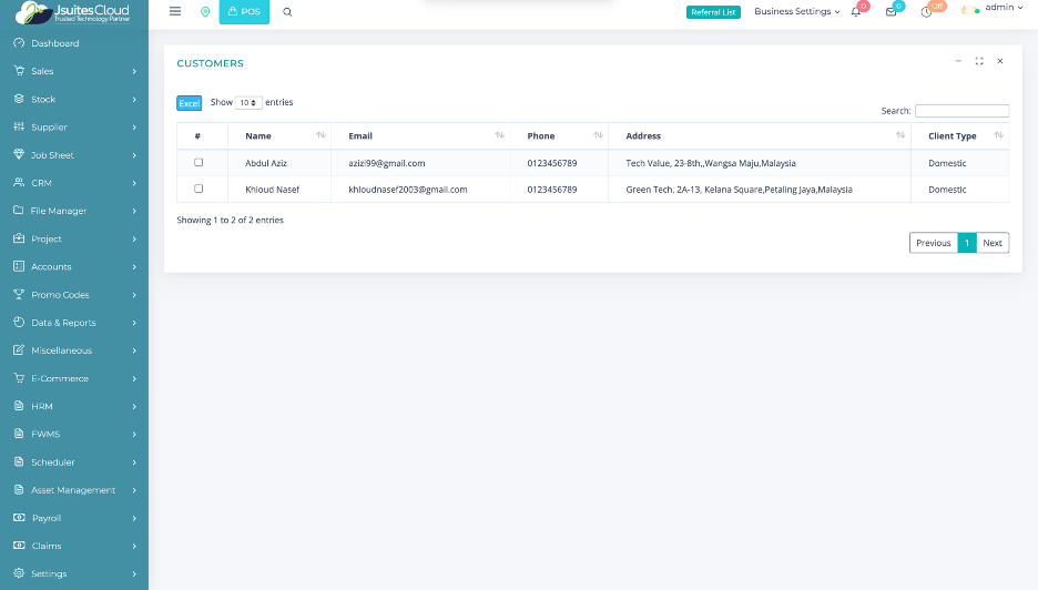 The Customer List provides an organized view of registered customers within the system. Details such as name, email, phone, address, and client type are available for easy reference.