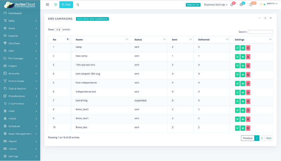 SMS Marketing features a list of email campaigns, sortable by Name, Status, Subject, and Scheduled. You can edit, view, and delete campaigns.
