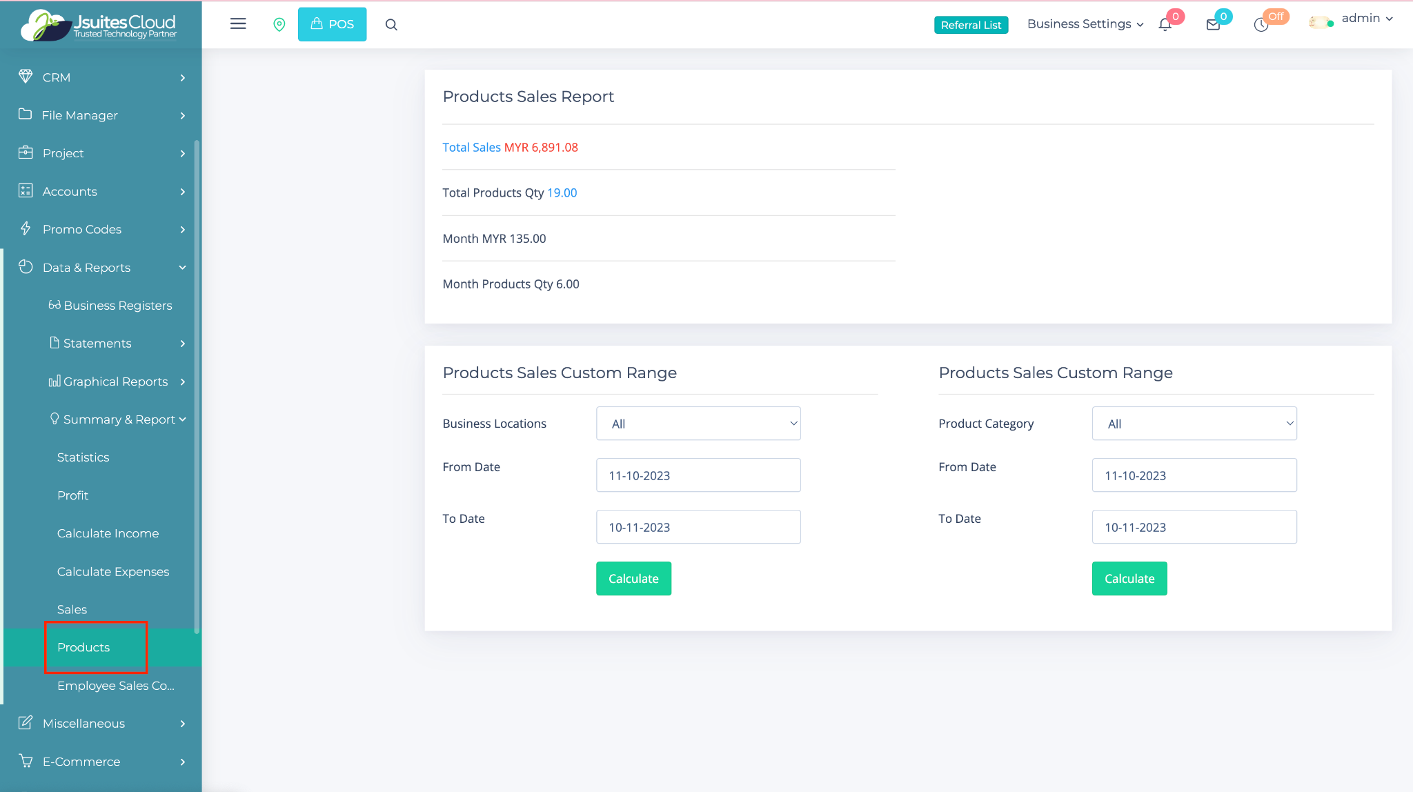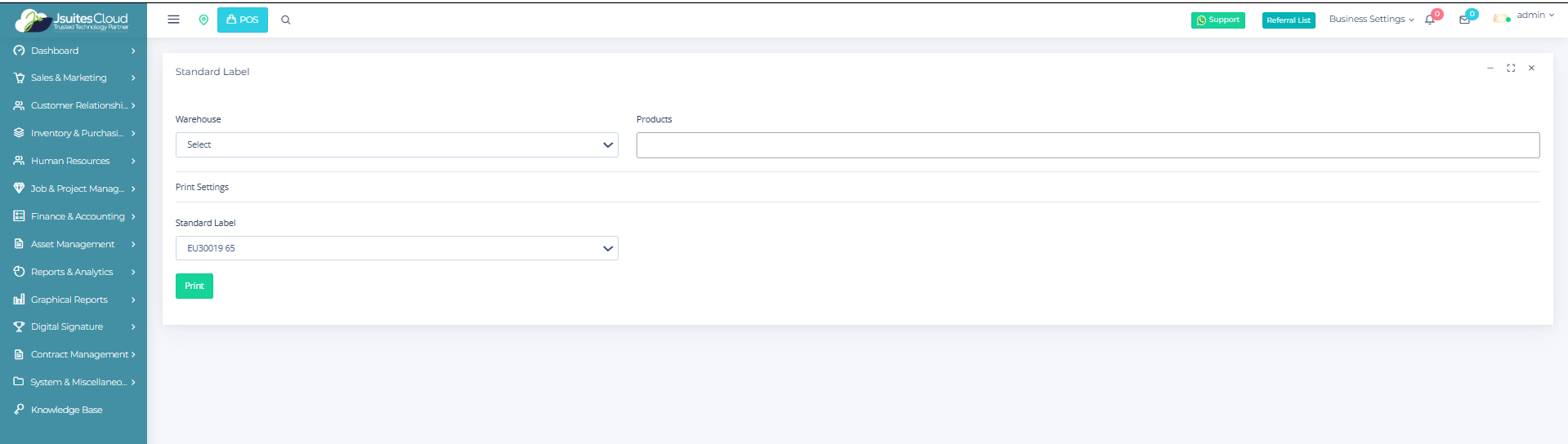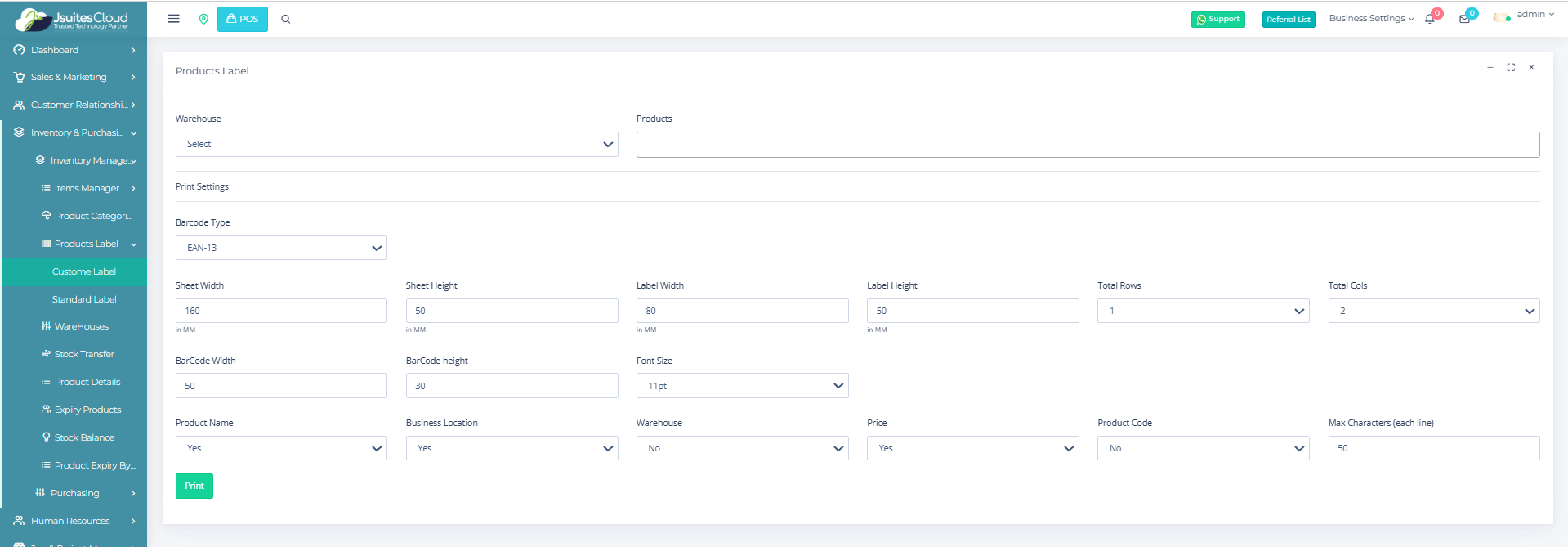 The **Product Label** section enables businesses to generate and print barcode labels for inventory tracking.