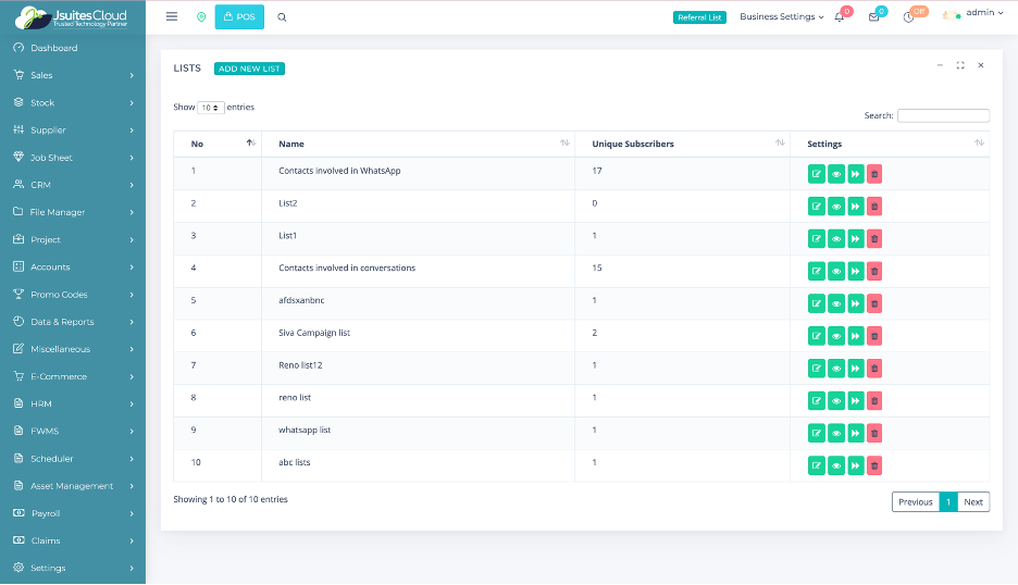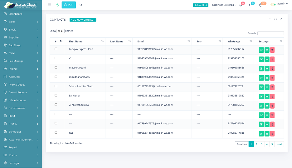 Contact Management allows you to maintain a list of contacts with details such as first name, last name, email, SMS, and WhatsApp. Edit, view, and delete options are available for each contact.