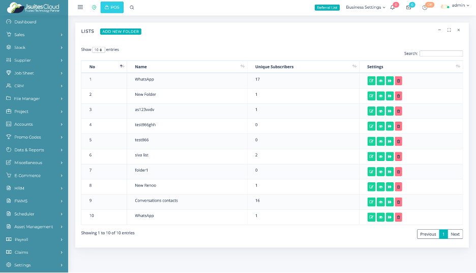 Folder Management presents a list of folders in the system, sortable by name and unique subscribers. You can edit, view, see contacts, and delete folders. The contact button redirects you to the Contact List.