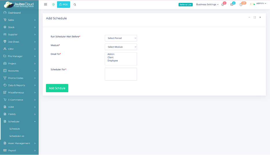 In the "Schedule" section, click on the "Add Schedule" button. Fill in the required details such as run scheduler alert before, module, email to, and schedule for. Save the schedule to activate it.