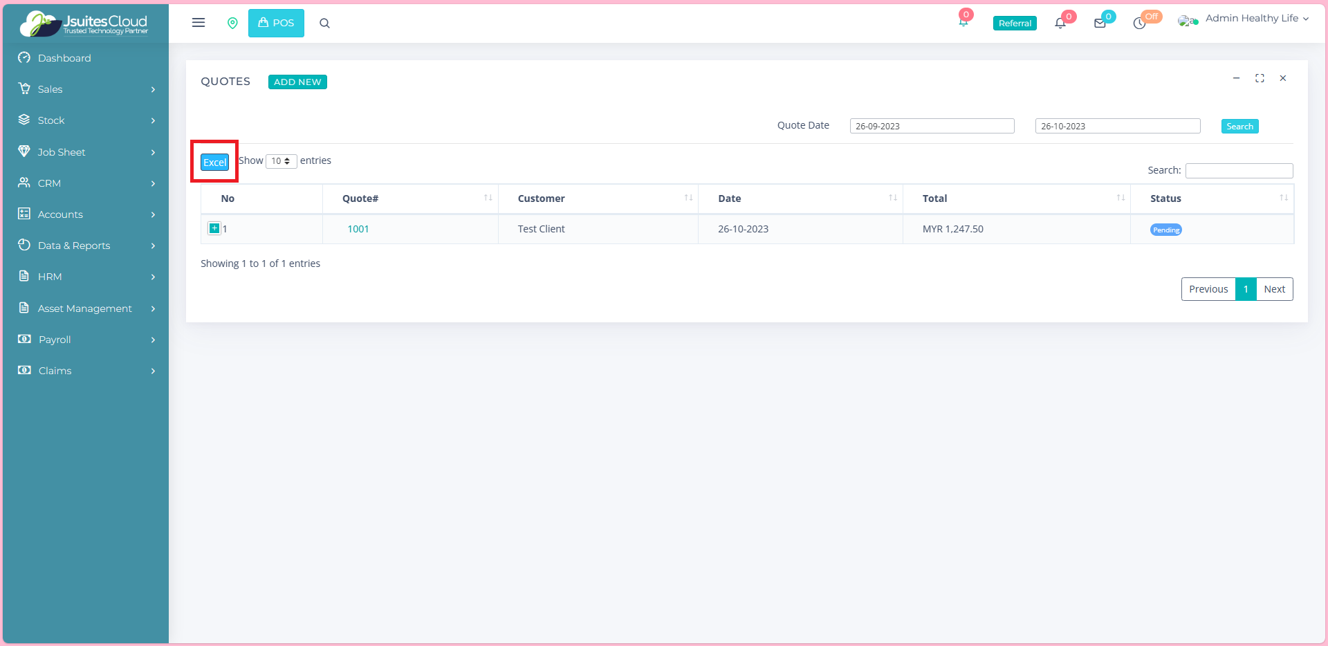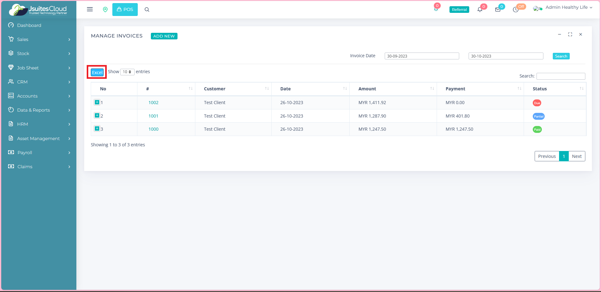 Exporting to Excel. Click on the "Excel" button to export all invoice data to an Excel sheet.