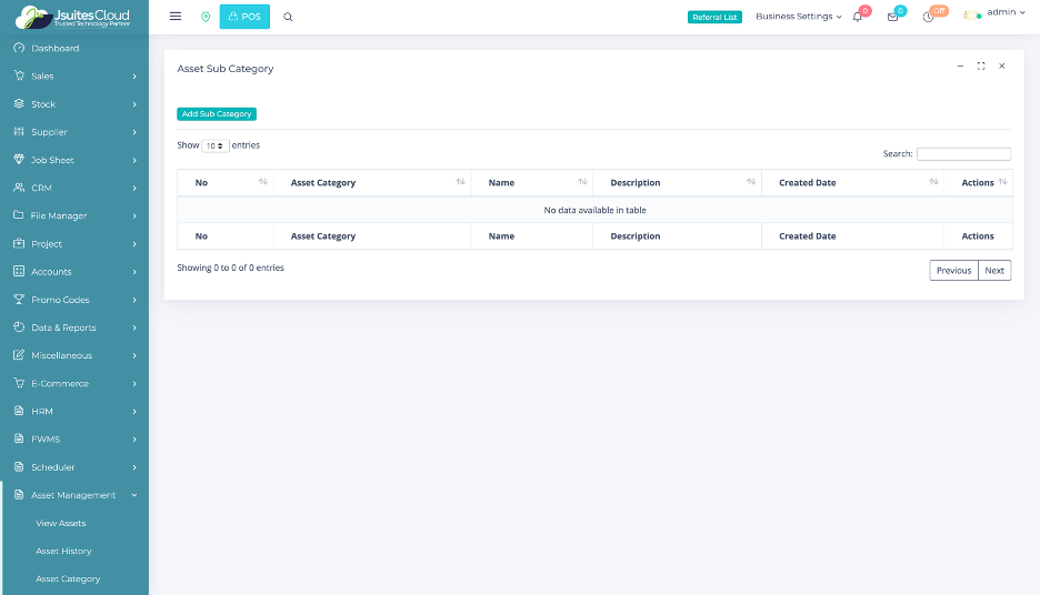 Asset Sub Category is a list of subcategories within the system. Users can add or create new subcategories and filter them based on Asset Category, name, description, creation date, and actions. This feature enhances the organization of assets into more specific subcategories.