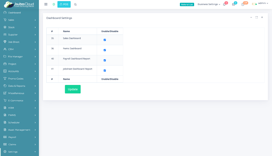 The Dashboard Settings section allows users to tailor the ERP system's dashboard according to their preferences. This customization enhances user experience and ensures that relevant information is easily accessible.