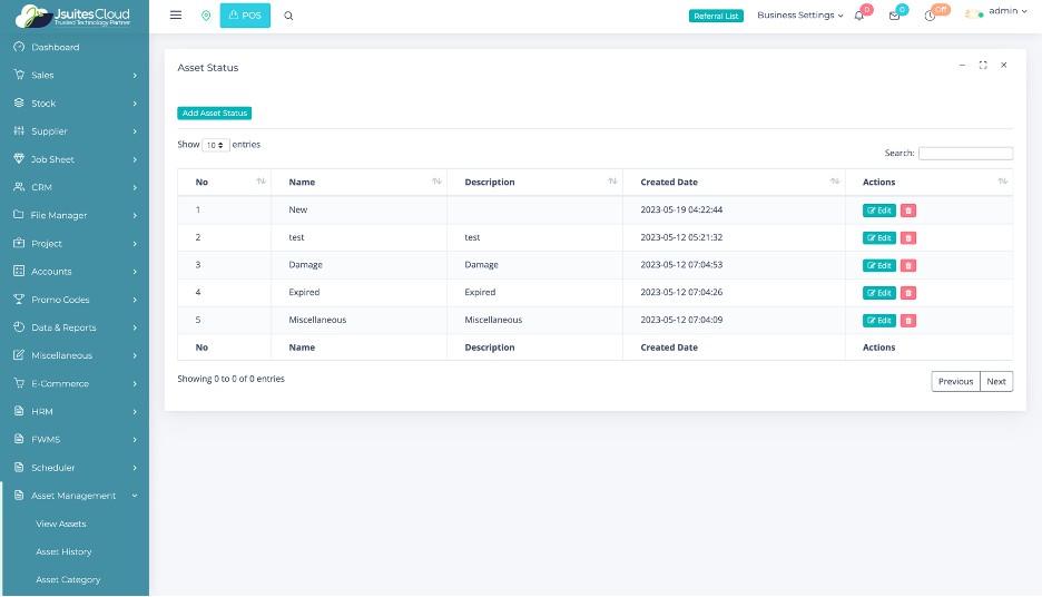 Asset Status provides a list of the current status of each asset. It includes the name, description, creation date, and actions (edit and delete) for each status. This feature allows users to manage the status of assets, ensuring accurate and up-to-date information.