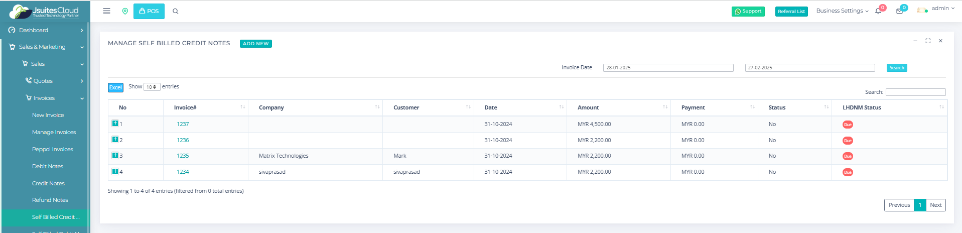 This section allows businesses to generate credit notes under self-billing agreements, helping track and manage credits issued to suppliers.