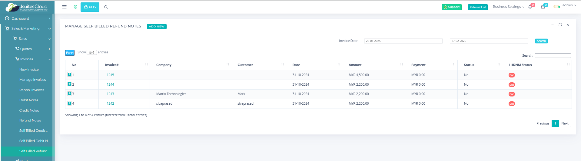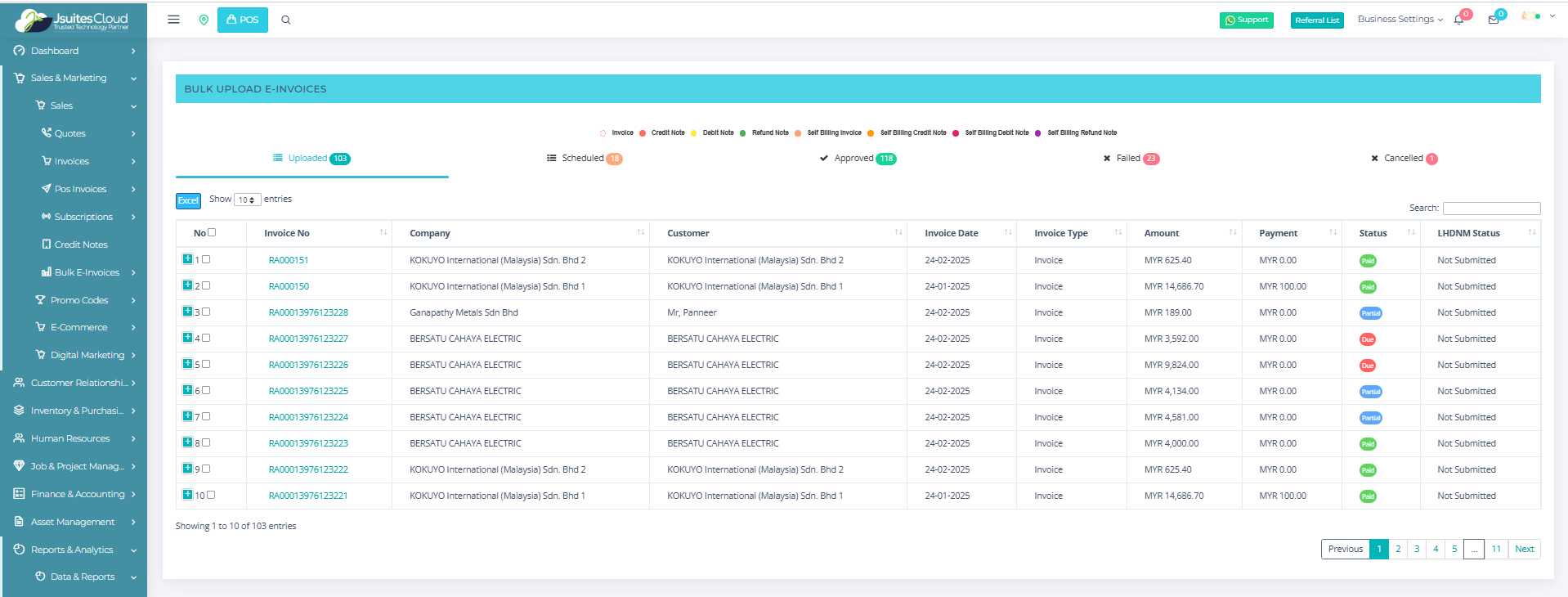 The E-Invoices List section provides a comprehensive view of all processed electronic invoices within the system. It includes essential details such as Invoice Number, Company Name, Customer Name, Invoice Date, Invoice Type, Amount, Payment Status, and LHDNM Submission Status. Users can efficiently search, track, and monitor their invoices using the available filtering and pagination features.