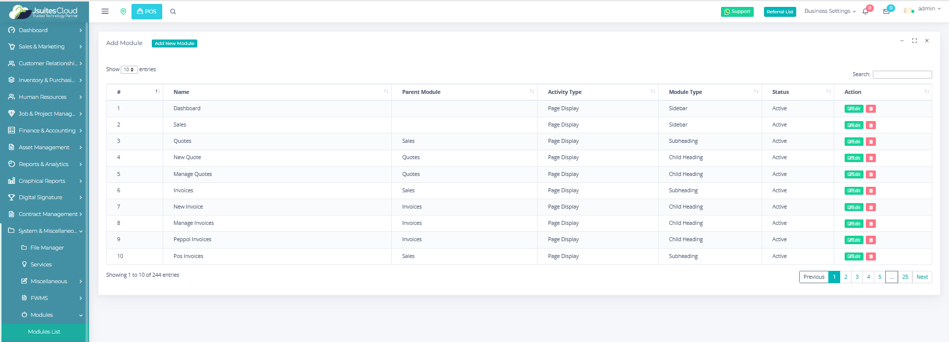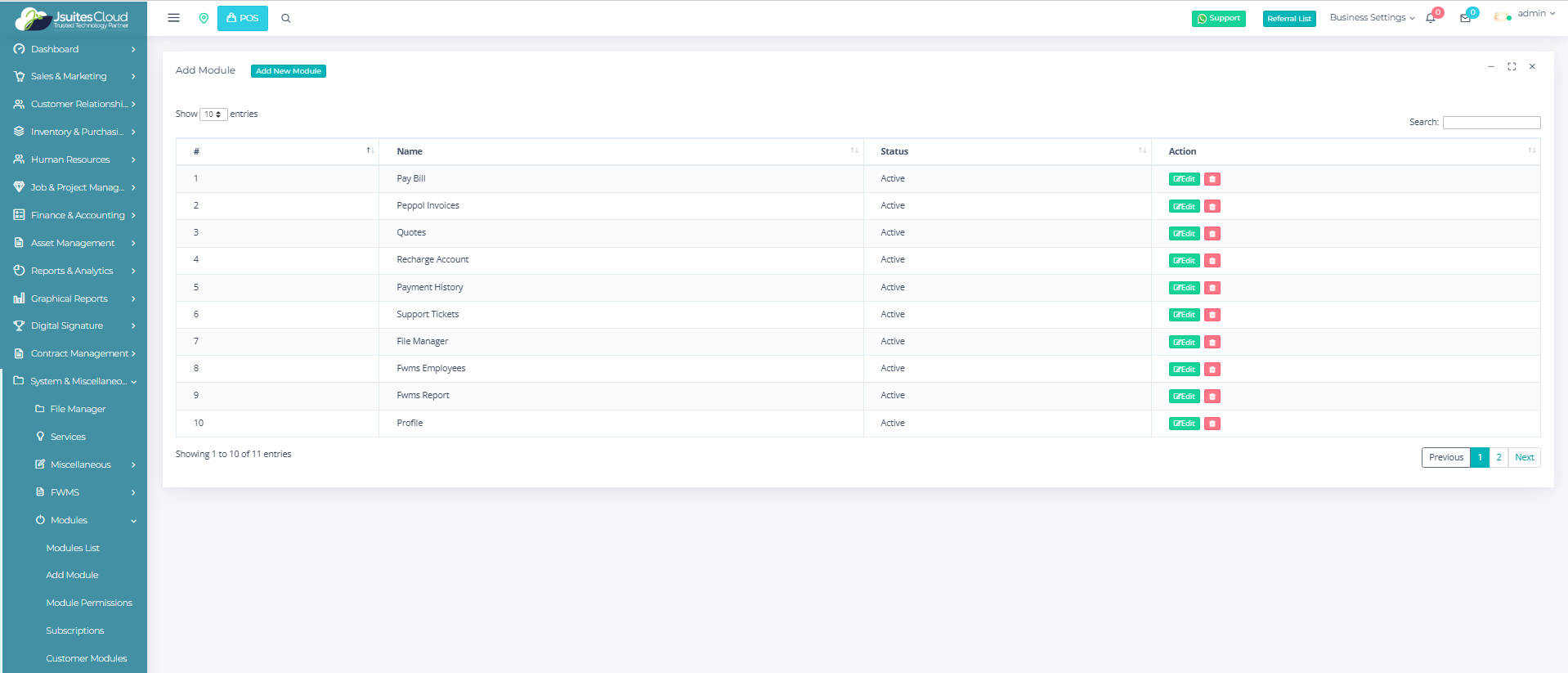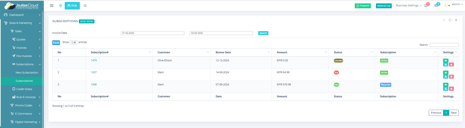 This section allows businesses to track and manage all subscription invoices, including active, due, canceled, and recurring subscriptions. It helps monitor renewal dates, payment statuses, and subscription details.