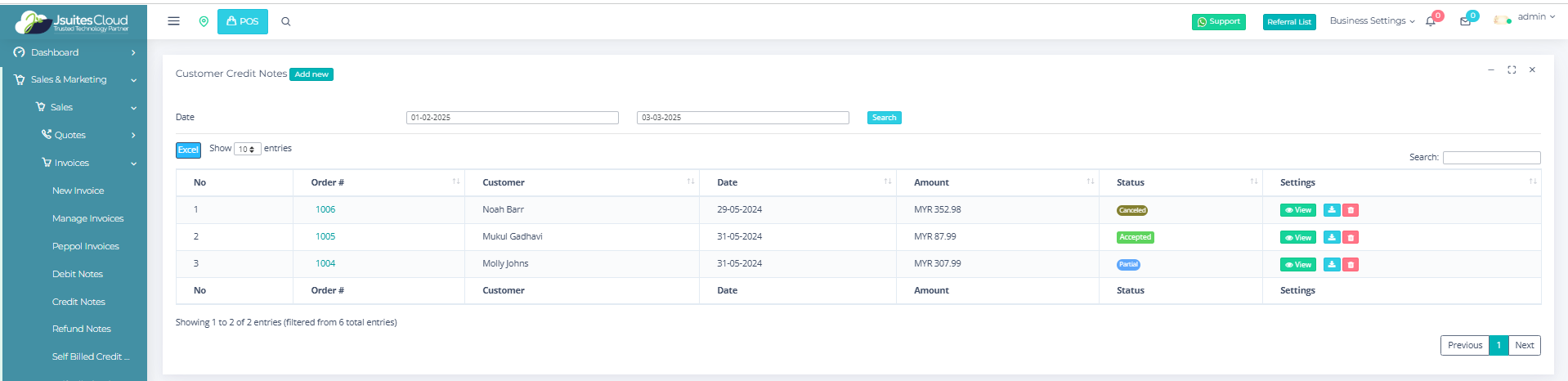 This section allows businesses to manage and track customer credit notes, issued for refunds, adjustments, or canceled transactions. Users can view the details of credit notes, including status, amount, and customer information.