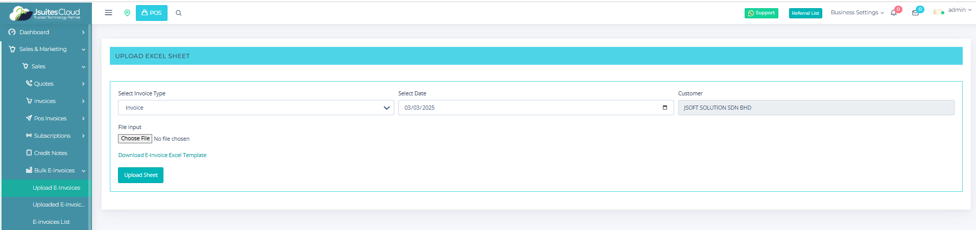 This section allows businesses to upload bulk electronic invoices using an Excel sheet. Users can select the invoice type, date, and customer, then upload the invoice file for processing.