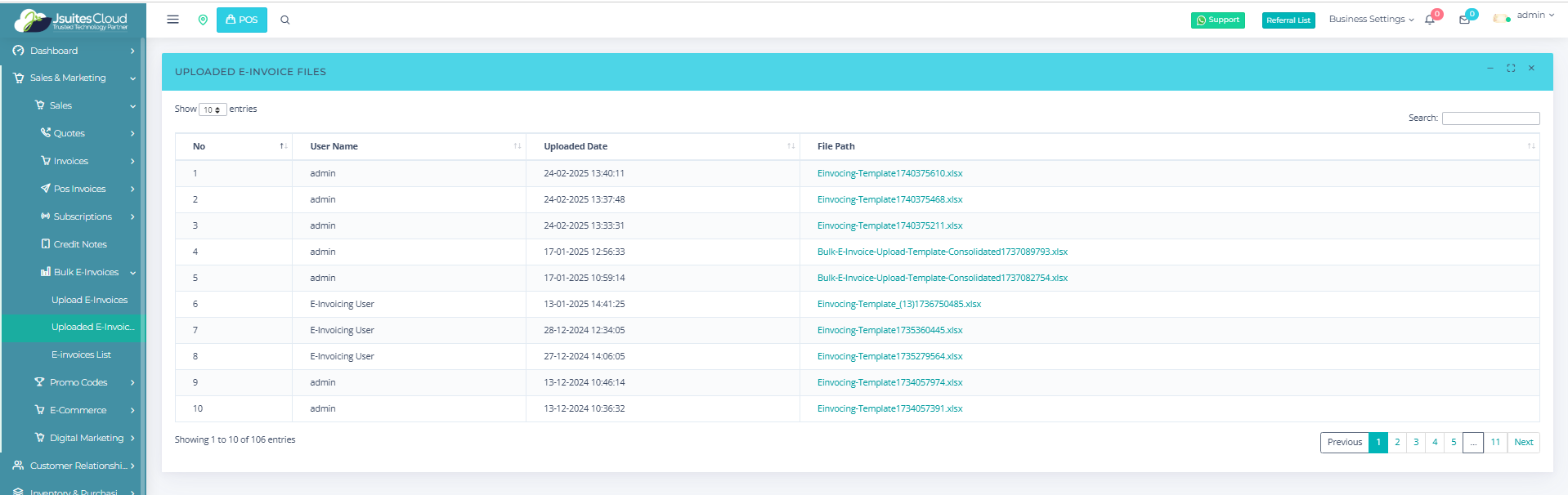 This section displays a list of all uploaded electronic invoices, including details such as user name, uploaded date, and file path. Users can search for specific uploaded invoices and track their status.