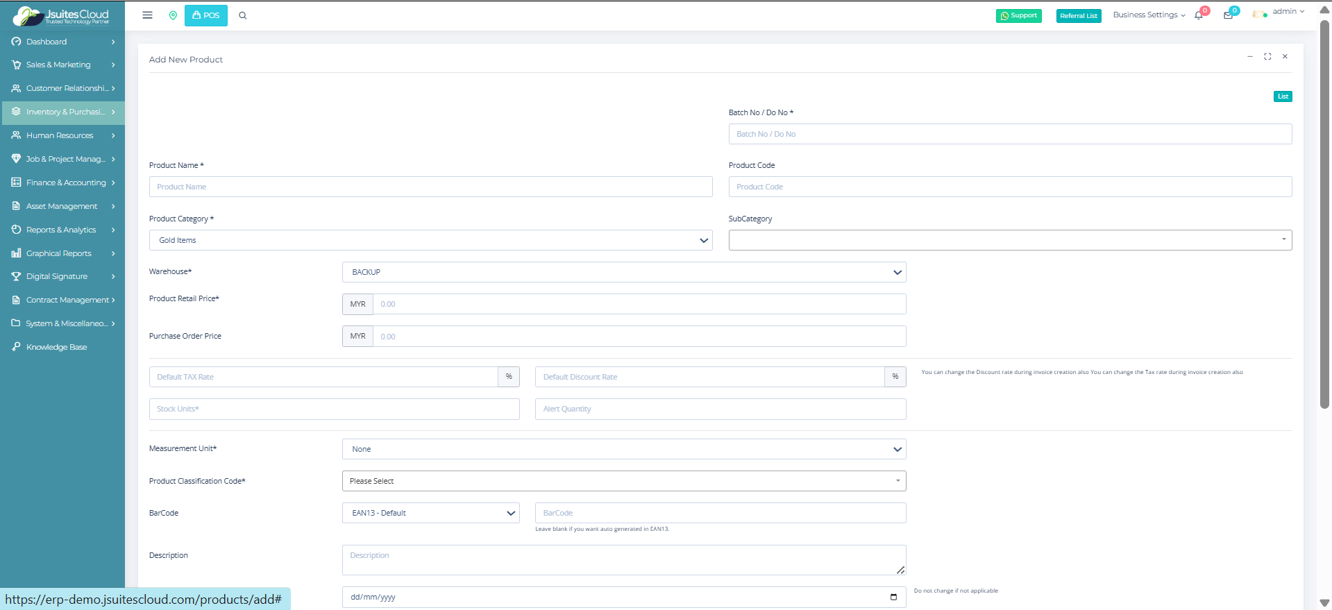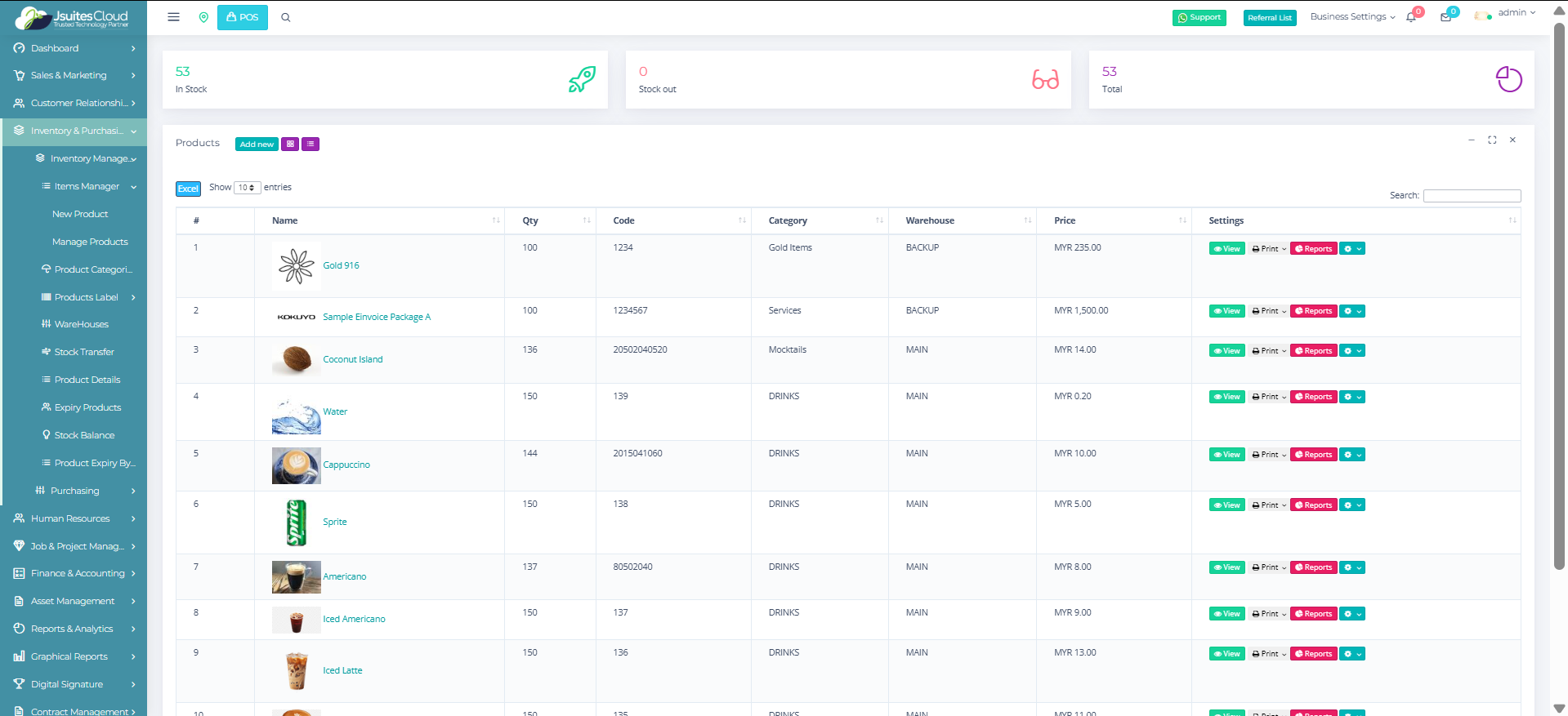 The Inventory & Purchasing module enables businesses to efficiently manage stock, warehouses, purchases, and product labeling. Users can track stock levels, update product details, transfer stock between warehouses, and generate detailed inventory reports.