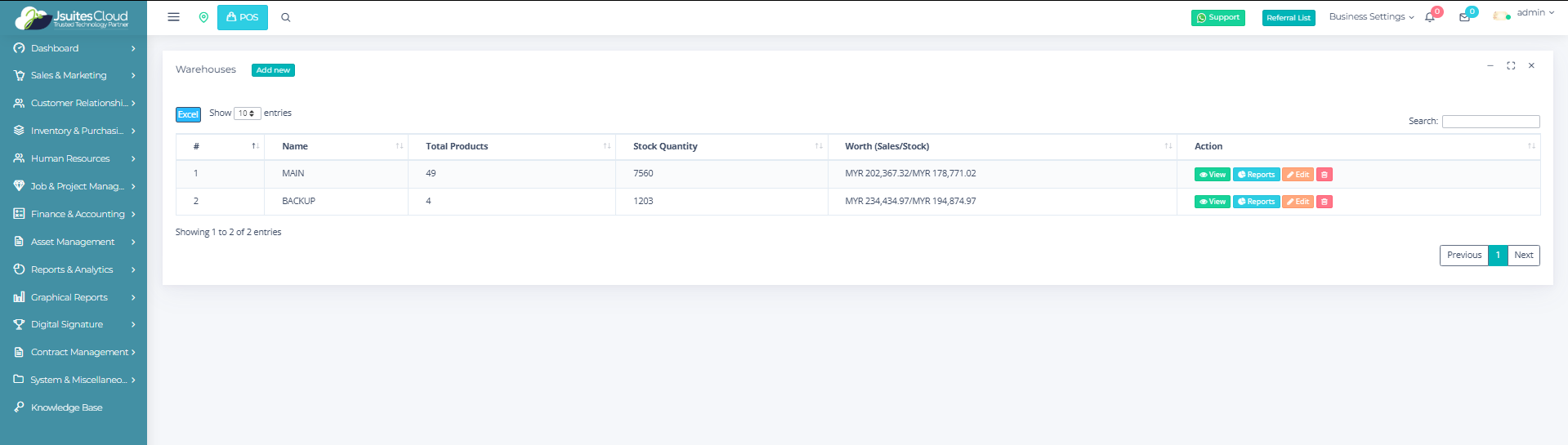 The **Warehouses** section manages multiple storage locations, ensuring proper distribution and stock tracking across different warehouses.