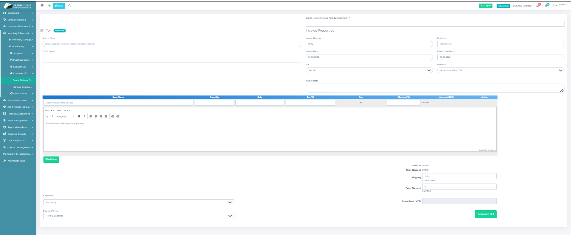 The **Create Delivery Order** module allows businesses to generate delivery orders for customers by specifying invoice details, items, and other relevant shipping information.