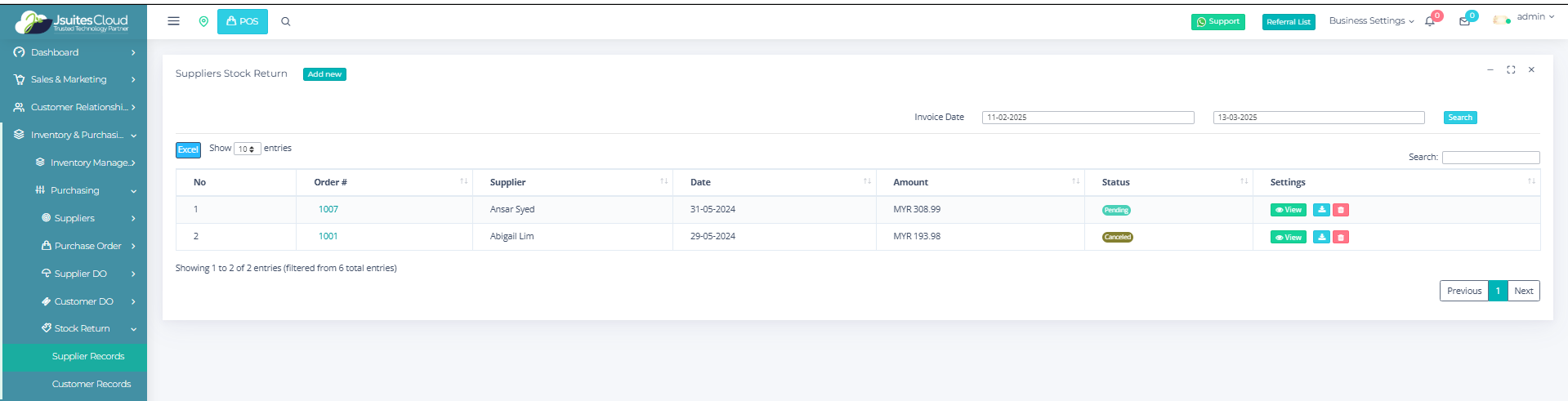 The **Supplier Records** section provides a list of supplier returns, allowing businesses to track return orders based on supplier details, date, amount, and status.
