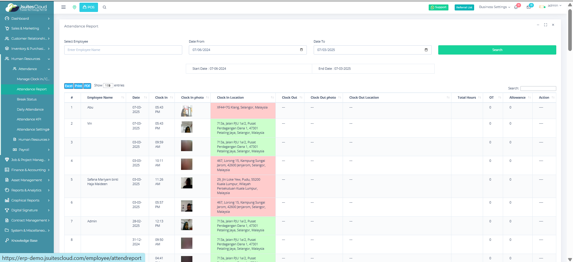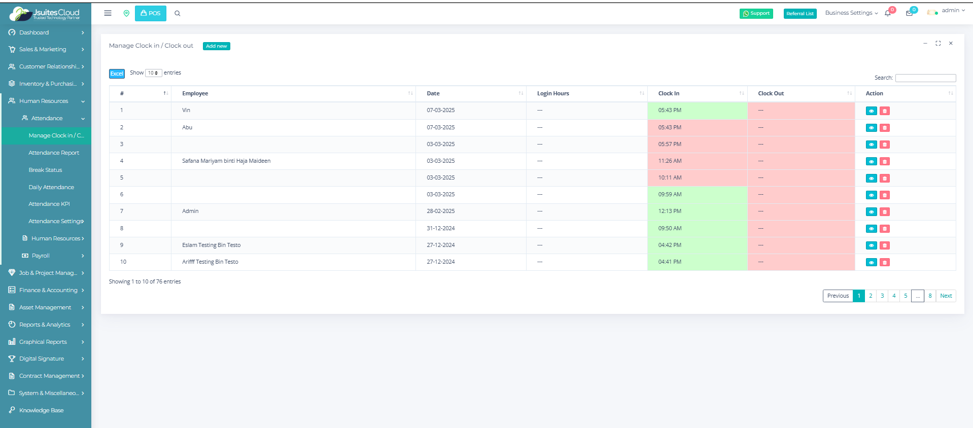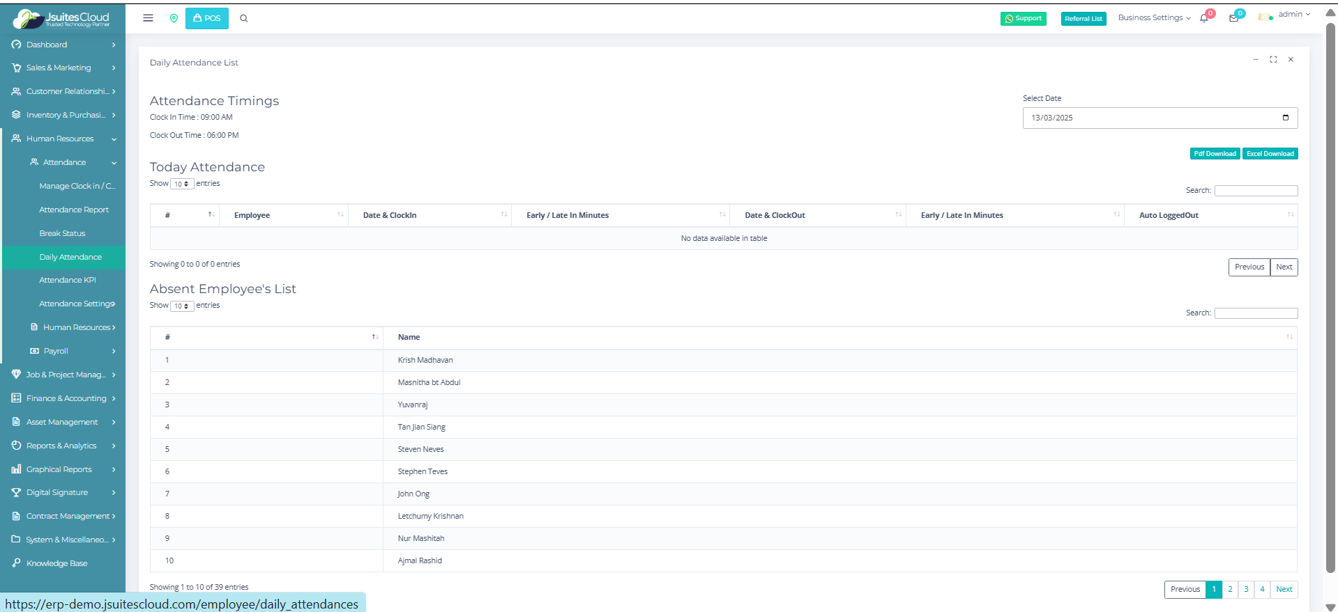 The Attendance section provides real-time tracking of employee clock-in and clock-out activities. It displays key attendance metrics such as :