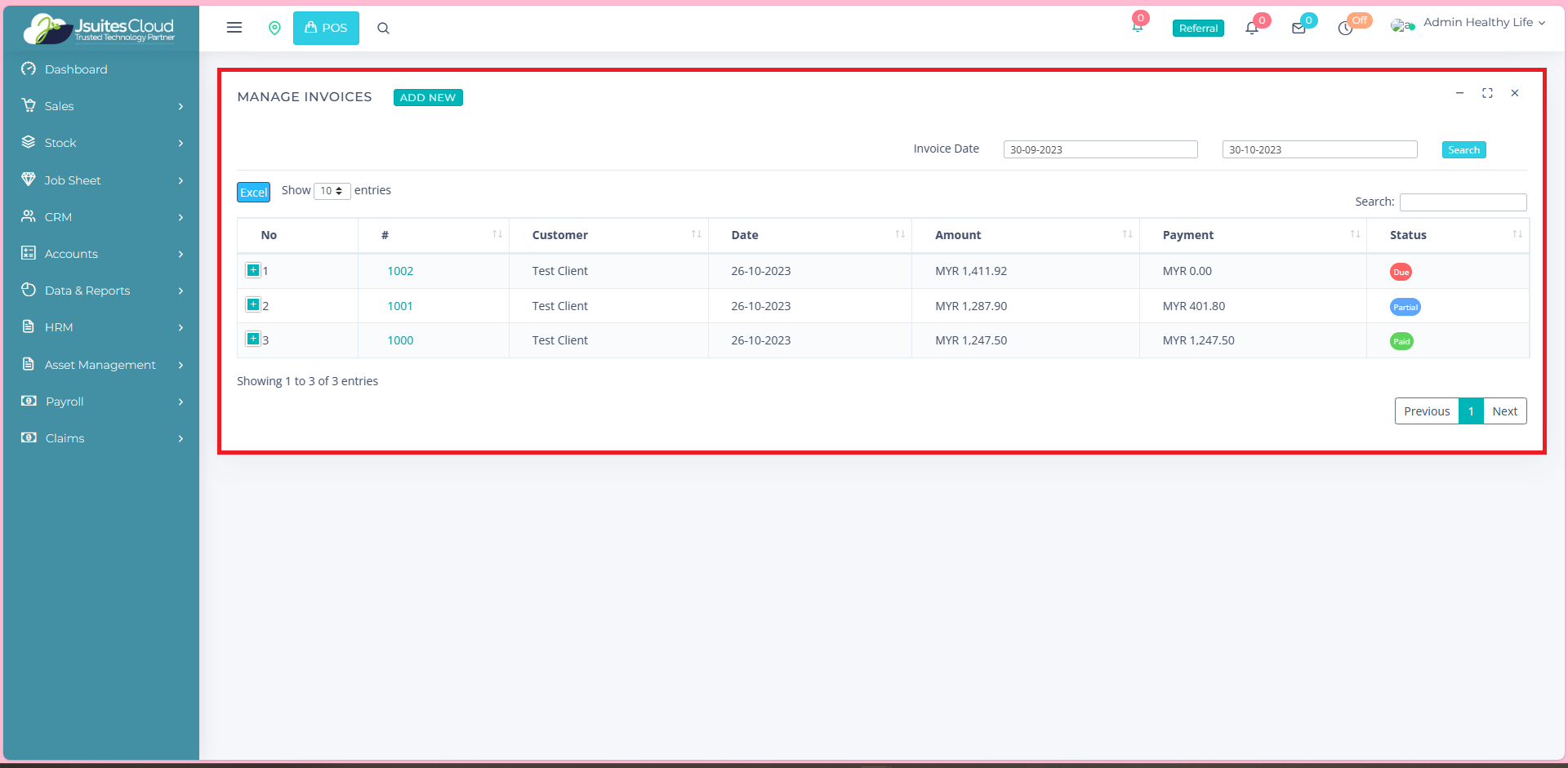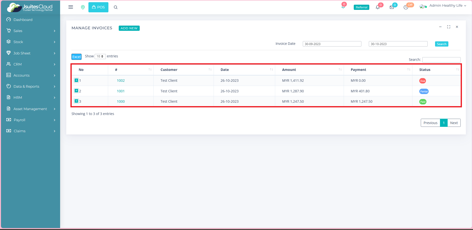 Using "ADD NEW". Click on the "ADD NEW" button to initiate the creation of a new invoice, leading you to the "New Invoices" page.