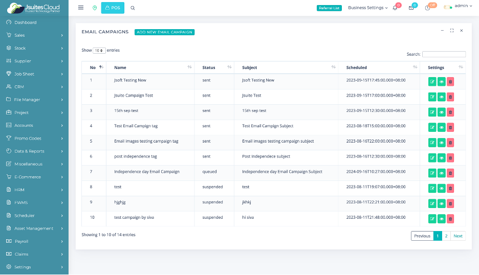Email Marketing mirrors SMS Marketing but focuses on email campaigns. It includes a list sorted by Name, Status, Subject, and Scheduled. You can edit, view, and delete campaigns.