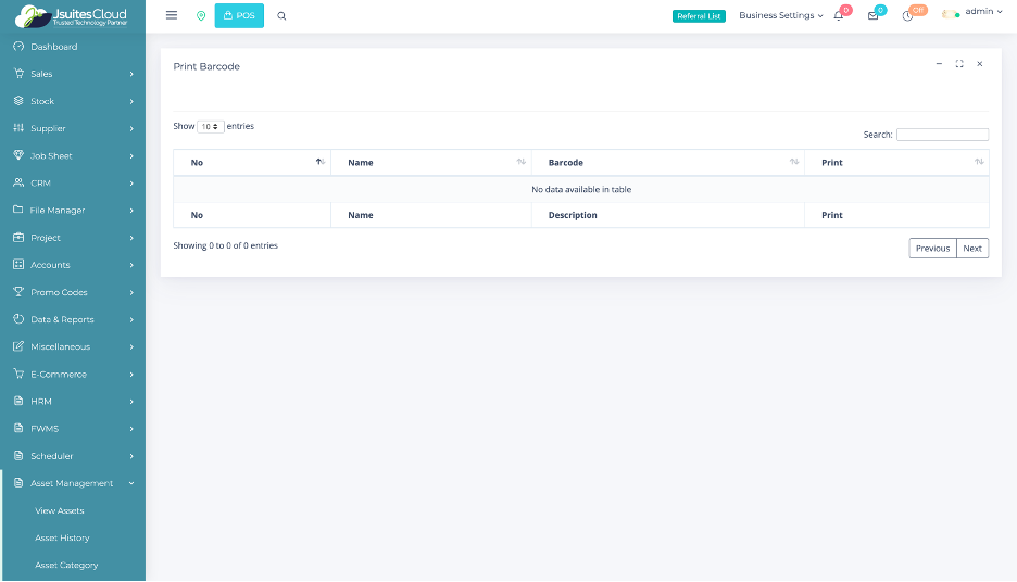 Print Barcode is a feature that provides a list of barcodes within the system. The list includes the name, barcode, description, and an option to print. This feature is essential for generating and managing barcode labels for efficient asset tracking.
