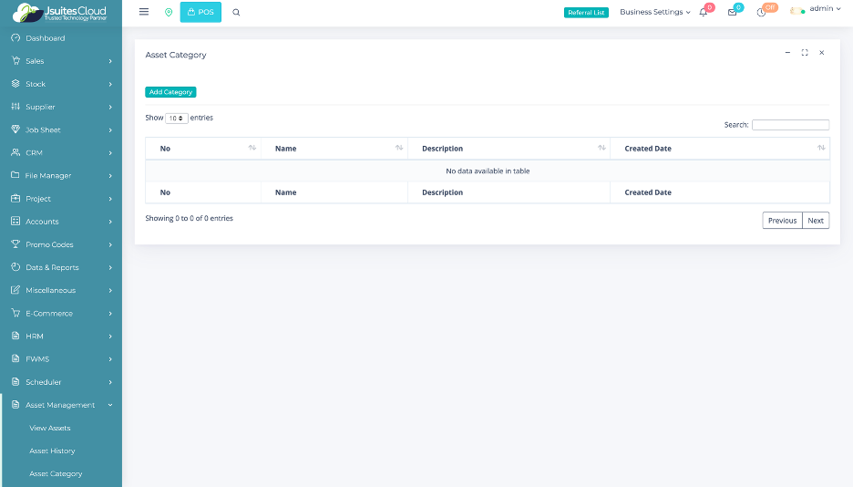 Asset Category displays a list of all asset categories. Each category is identified by a unique number, name, description, and creation date. This feature helps organize assets based on their categories, making it easier to manage and analyze them.