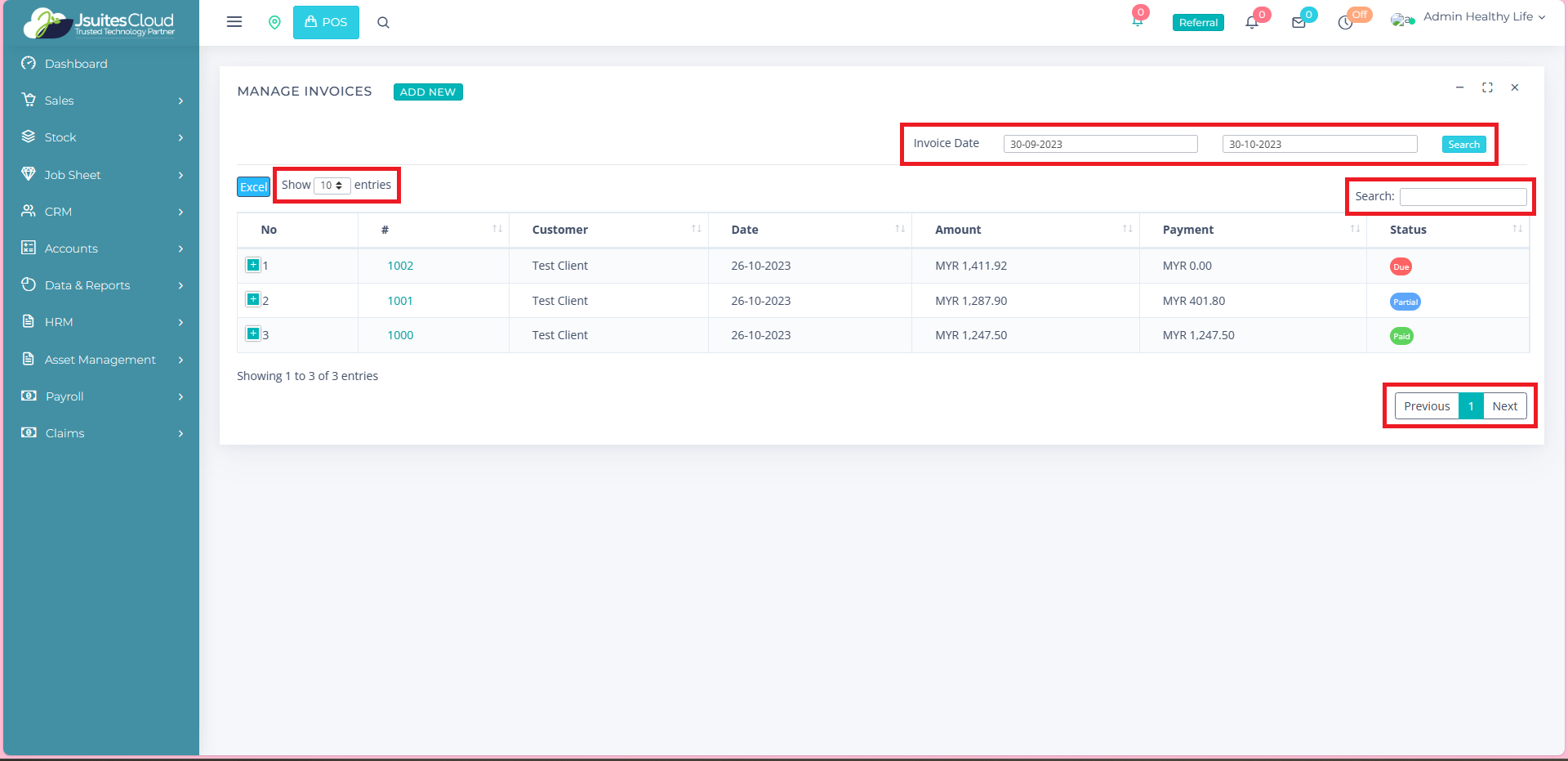 Search by Date. Use the "Search" button to filter invoices based on the date of creation.